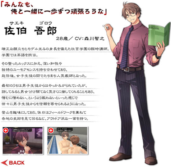 相貌端正,又具有模特般的高挑身材的杜宫学园临时英语老师。由于整齐的相貌,加上十分知性又独特的幽默感,在上任后很快成为女生们中很有人气的老师。刚开始虽然被许多男生所讨厌,但在与他聊天后或是感觉到他不分男女平等对待的心理后,开始不讨厌他,也不再对他抱有敌意。现在众多男生都对他十分信赖。有登山的兴趣,在休息日会游览各地史迹,兼做实地考察的工作,拥有户外性的一面。