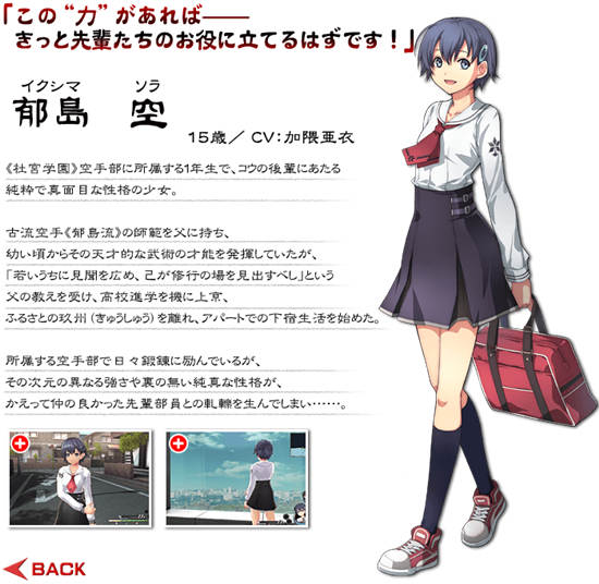杜宫学园空手道部所属的高一学生,洸的学妹,是一个性格十分单纯的少女。父亲是古代空手道流派“郁岛流”的师傅,很小的时候就显现出天才的武术才能。由于受到父亲“想在年轻时就有广阔的见闻的话,就到修练场外面去吧”的教导,借读高中的机会来到东京,离开故乡玖州,开始了公寓生活。这个在空手道部每天锻炼,再加上不属于这个次元的强大武艺和毫无心机的单纯性格的女孩,却意外地和本来关系融洽的前辈产生了矛盾...