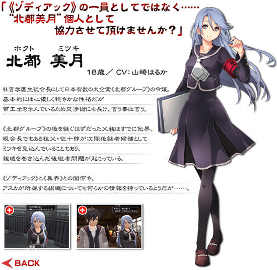 杜宫学园的学生会长,日本有名的大企业“北都集团”的大小姐。具有基本的好心肠和稳重的性格,又因为学习帝王学而擅长与他人交涉,说到做到。身为“北都集团”的继承人的父亲去世后,身为现会长的祖父北都征十郎决定立美月为继承者候补,由此引发了北都家关于继承者问题的争斗。似乎掌握着关于“黄道”和“异界”的关系,还有明日香归属的组织的种种情报……
