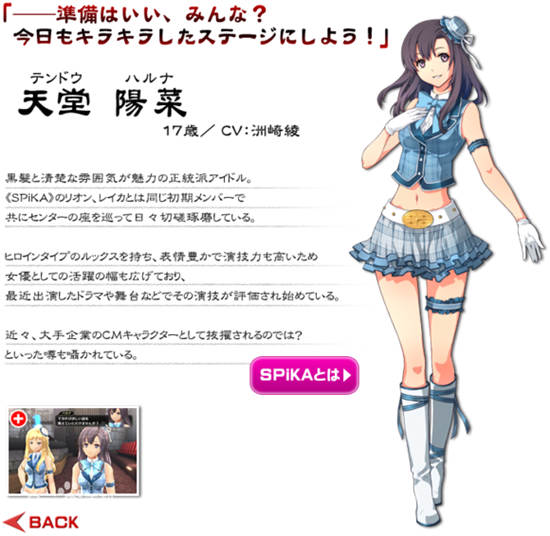以婀娜的外表和语言风格赢得人气的现役高中生偶像。是五人组偶像团体“SPiKA”的一名成员,利用高超的歌唱能力作为武器,与和自己不同类型的另外两名同期成员争夺“Center”的位置。在看上去有些轻浮的背后有着讨厌失败的努力家的另一面,为了不输给既是亲密好友也是对手的两名同期成员,天天为了提高表演能力而在自己练习。