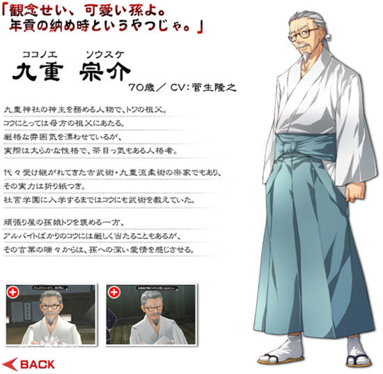身为代代相传的古代武术“九重流柔术”的宗家,其实力毋庸置疑。曾经给进入杜宫学园读书之前的洸教授武术。一方面很赞赏努力工作的孙女永远,另一方面对尽是打工的洸有些严厉,但是从一些话中也能感觉到他对外孙洸深深的爱。