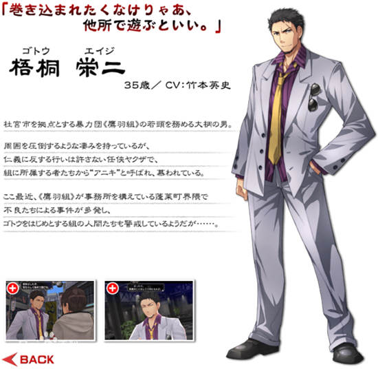 担任以杜宫市作为据点的黑社会团体“鹰羽组”的小头目的壮硕男子。虽然拥有甚至能压倒周围人的强大威压,但是其个人却是痛恨违背道义的行为的侠客型黑老大。也因此被手下称作“大哥”,仰慕着。最近在“鹰羽组”事务所所在的蓬莱町边缘地带多次发生了由不良少年引发的事件,以梧桐为首的“鹰羽组”相关人士也开始警戒起来……