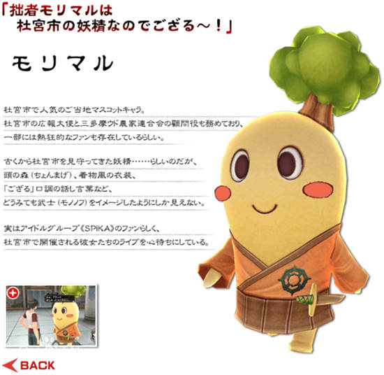 杜宫市内十分有名的当地吉祥物。作为杜宫市的旅游大使和“三多摩龙眼农户联合会”的顾问,拥有许多狂热粉丝。自古以来守护着杜宫市的妖精……好像是这么回事。头顶的树、和服式的衣着、“gozaru(ござる)”结句的语言特点等等,不管怎么看都让人感到其武士的形象。事实上据说其是偶像团体“SPiKA”的粉丝,期待着她们在杜宫开办的演唱会。