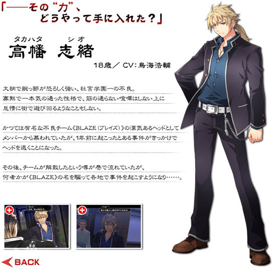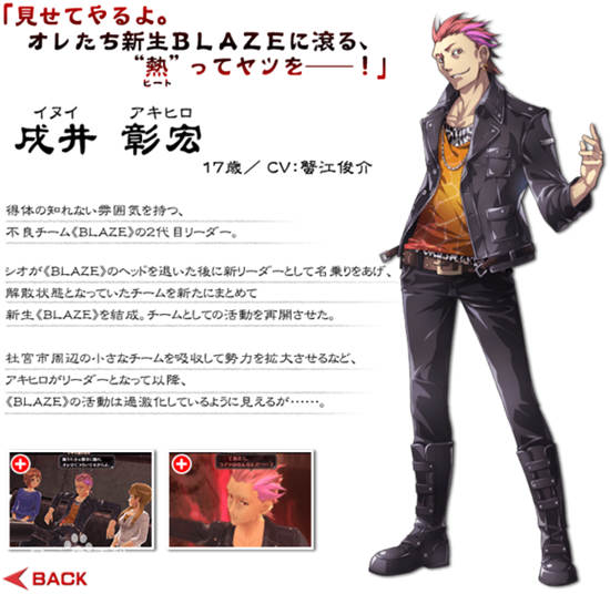 一副没有礼貌的样子的不良团体“BLAZE”第二代首领。在高幡志绪离开首领位置后当上新的首领,重新将几乎处于解散状态的团体集合起来组成新生BLAZE。并重新开始活动。吸收杜宫市附近一些小的不良团体以扩大势力,似乎使BLAZE的活动开始朝过激化发展……