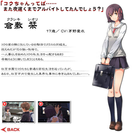 住在洸隔壁的青梅竹马,同时也是洸的同班同学。外表腼腆内心坚强,由于过于担心开始一个人生活的洸,时常像母亲一般插手他的私生活。在杜宫学园内过着平凡的高中生活,但是某天却卷入了杜宫市内发生的“异界化”事件…