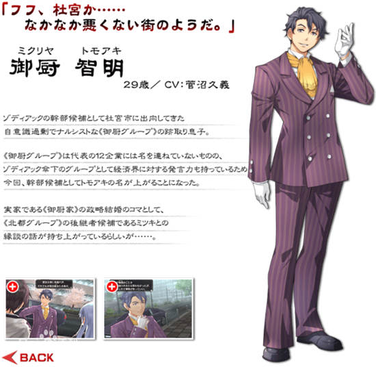 作为“黄道”后备干部而来到杜宫市的“御厨集团”的继承人,是一个极端个人主义的自恋狂。“御厨集团”的名字虽然不在代表“黄道”的12大企业之中,但作为“黄道”旗下的公司在经济界具有相当的影响力和发言权,因此这次智明被推上了“黄道”后备干部的位置。作为本家“御厨家”政治婚姻计划的一部分,似乎在与“北都集团”的下任继承者——北都美月相亲……