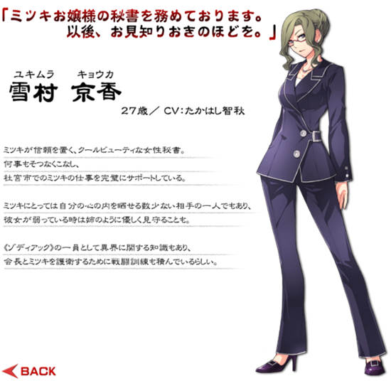 美月十分信赖的冷美人秘书。办事毫无差错,协助美月在杜宫市的工作。是美月能够袒露心声的极少人之一,在她不知所措时也会像姐姐一般安慰她。作为“黄道”的一员掌握着一些异界的知识,为了保护会长和美月好像掌握了一些战斗技能。