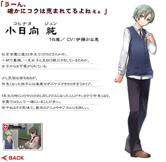 杜宫学园高二学生,洸的同班同学。由于个子小和孩子般的容颜,乍一看还以为是个女生,受到众多女生的“喜爱”。虽然有时会有软弱的一面,但对关系好的人会直言不讳。由于高一时与洸、辽太分到一个班所以三人关系很好,校园中三人也时常结伴而行,有一点宅,对最近的动漫和二次元文化十分了解。