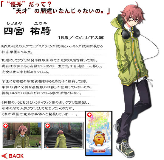 IQ超过180的天才,擅长程序编写和黑客技术的杜宫学园高一学生。虽然只有16岁但是已经通过开发app和炒股挣了大钱,目前在杜宫市内的一间高级公寓过着优哉游哉的生活。彻底看不起世界。为了取得高中毕业文凭而在杜宫学园就学,但是只保证了最低限度的出勤,导致校内绝大多数学生不知道此人的存在。开发了XIPHONE的占卜app“正如老天所言”,在年轻人间很有人气,但这也是后来令祐骑陷入意外事件的原因……