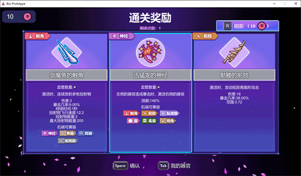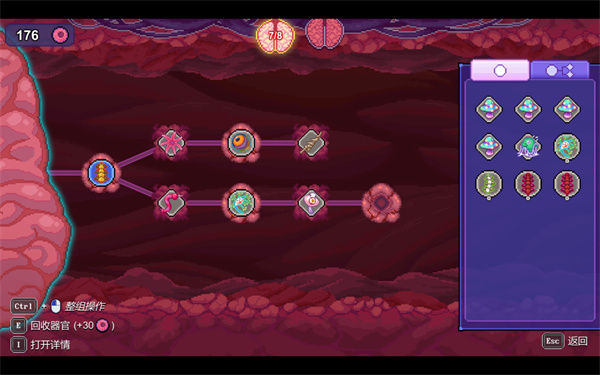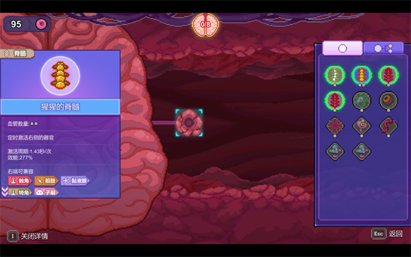 不同的激活器官的激活周期,效能存在差异,激活周期自然不必多说,而激活器官的效能会直接影响其右侧的攻击器官的伤害,效能与右侧攻击器官的基础伤害的乘积才是最终伤害。在这众多器官中存在一小类特殊器官,除了效能之外,他的最终效果还与距离大脑的距离有关。不同的触发方式、不同器官的兼容性,距离衰减多种因素的影响下,玩家需要缜密布局,调整器官的摆放顺序,虽说相比其他割草游戏难度提高了不少,但这也带来了更多的乐趣。