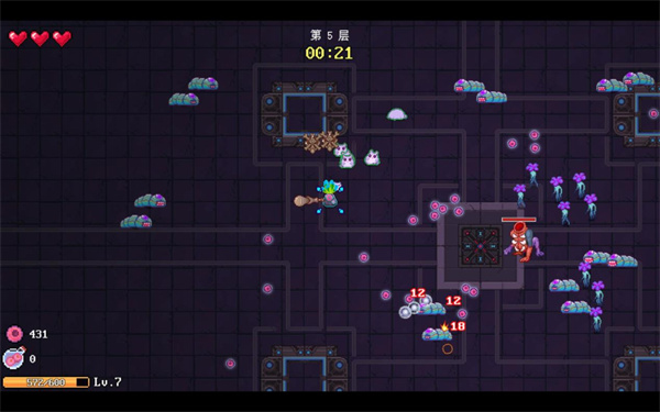 常规关卡中大范围的空地为玩家提供了不少的操作空间,即时前期未能击杀足够的怪物获取资源提升自己的能力也可以通过娴熟的操作,躲避敌人的包围,等待计时结束强制清场。而不注重自身属性的强化,显然这并不是制作组期望的玩法。或许正因如此,在最终的boos战中地图被分割为多个区块,玩家无法跨区块移动,这直接限制了操作空间。倘若玩家此时伤害依旧不足,甚至无需boss出手,逃课玩法导致的伤害不足令玩家无法及时处理刷出的小怪,加之小范围的空间令玩家无法腾转挪移,最终被小怪淹没。