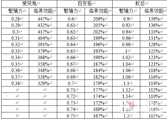 下表列出了不同繁殖力的距离2子嗣的临界效能。爱哭鬼和百变怪的繁殖力随机范围是不随稀有度而改变的,在选取器官时要特别注意。而蚁后则是稀有度越高繁殖力也越高。