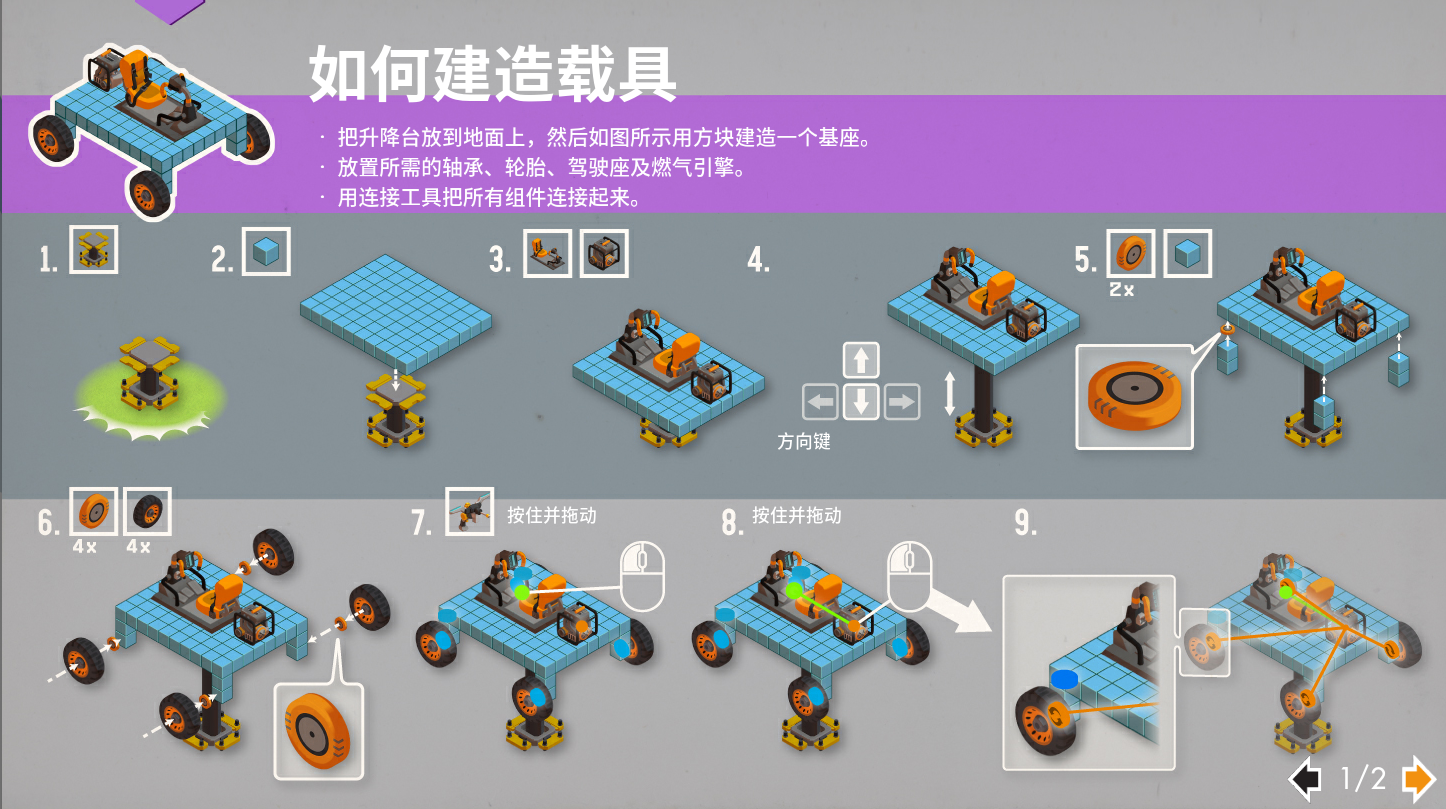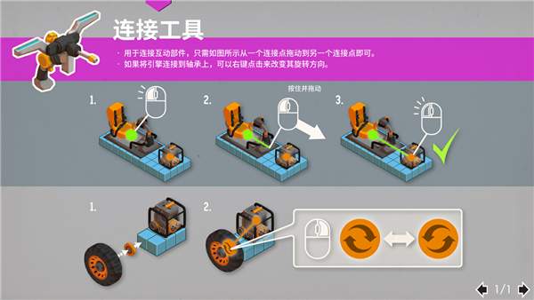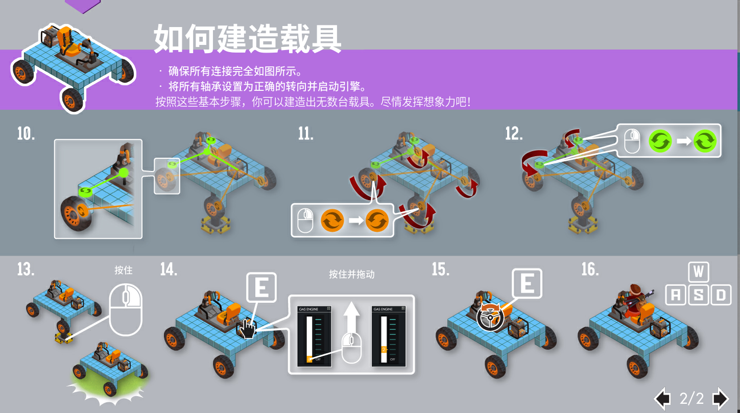 1、允许你通过拖拽节点的方式连接可互动的部件。这包括轮子和引擎、方向盘与轮子。