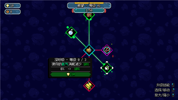 随着你的收集、推进与探索,你将获得更多提升技能的机会。庞大的分支技能树,您可以挑选自己喜欢的技能并定制未来的征程,以最大化您最想要的东西——从氧气罐数量到商店的大小!