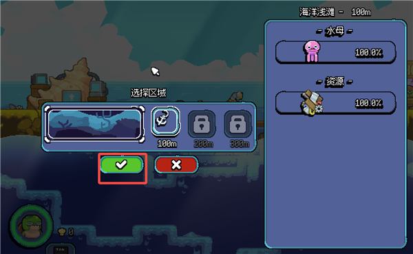 3、选择下潜深度,目前我们只能探索100m的区域,右方展示了该区域拥有的水母以及其他资源。
