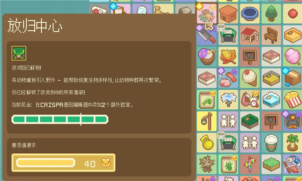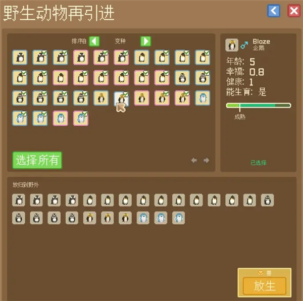 种群管理中心:用于手动放生动物。在笼舍内点击捐赠要方便。既不用付物流费,又能获得善良点数、帮助种群恢复,非常好用。