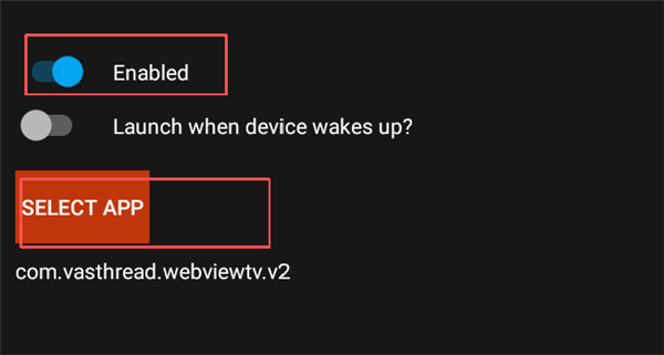 3、我们安装【Launch on Boot】后,勾选【Enabled】启用此功能,然后选择【Select App】,选择【WebView电视】就可以了。