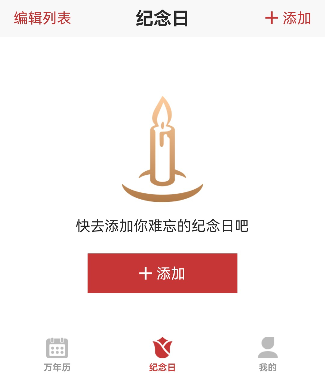 1、点击下方【纪念日】,进入纪念日页面。点击红色的【+添加】按钮。
