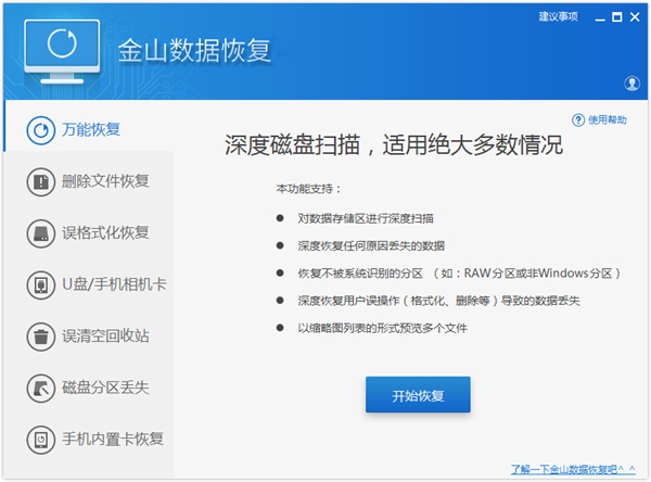 对于频繁使用电脑的网民,我们习惯在自己的电脑上放置各种工作文件,喜欢的视频,家人的照片,这些东西都是我们日常工作和生活不可或缺的。但是我们很少会意识到他们的重要性,也不会对日常数据进行整理和保护。一旦出现意外,我们才会意识到数据的重要性,这个时候,已经后悔莫及了。其实,这是时候,你可以考虑使用金山【数据恢复】。