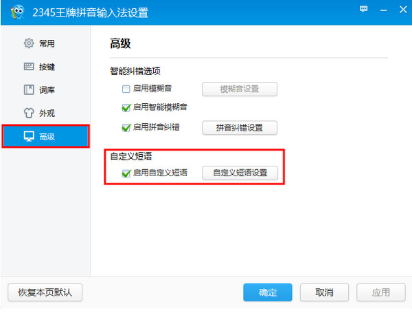 “自定义短语功能”在右键菜单——设置——高级(如图所示)