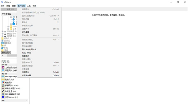 1、打开程序,可直接将要处理的图片拖拽到程序中即可查看2、点击图片任务,在这里用户可进行祛除红眼、重命名、调整大小、设为桌面、转换图片格式、提升图片质量、比较文件夹等各种操作