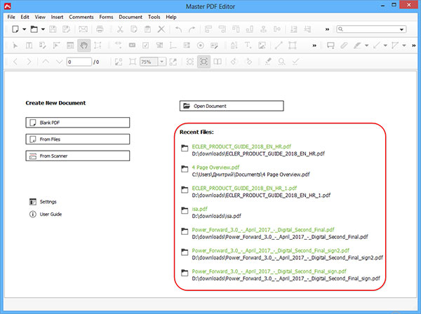 主PDF编辑器会记住最近打开的文件。您可以按照以下步骤快速重新打开其中的任何一个: