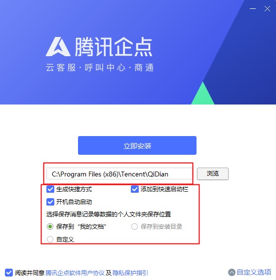 1、下载好数据包后,直接解压用鼠标双击“.exe”打开进入安装向导,选择安装位置,默认路径为“C:\Program Files (x86)\Tencent\QiDian”在需要的选项前面勾上,比如“生成快捷方法”。然后在同意相关协议也勾上。最后点击“立即安装”即可