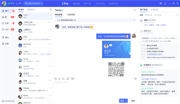 工作台支持一键发送企微同事名片。企业微信与企点账号绑定成功后,可同步企微通讯录,支持客服在工作台一键发送企微同事明信片,提升客户内部流转效率,打通企业私域营销。