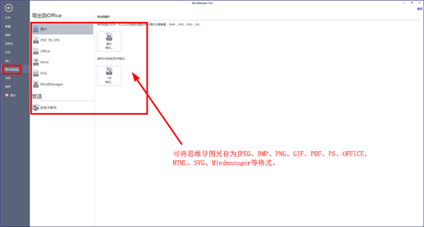 11、大功告成以后就得将我们的作品进行保存了,点击“文件”,回到软件初始界面,找到“导出和发送”,可以任意保存为图片、PDF、Office、html等等格式,然后找到需要保存的格式,点击确定即可。