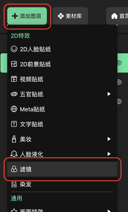 「添加图层」按钮,在下拉菜单中,选择2D特效-滤镜