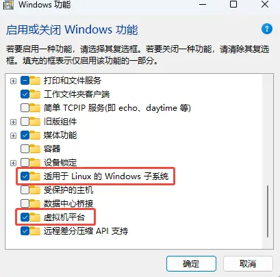 ② 虚拟平台。Win 图标右键选择搜索,搜索“启用或关闭 Windows 功能”,检查这两项是否打开“虚拟机平台”在某些系统版本下也叫 VIRTUAL MACHINE PLATFORM。如果两项没有被打开,需要勾选确定打开后重启电脑再使用特效工具。