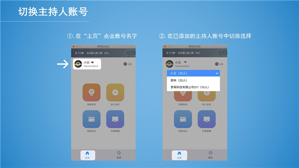 1)如果您有企业版主持人账号,您可以在主持人管理界面添加绑定企业主持人账号,并根据您的会议情况切换使用。