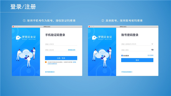 首次使用梦网云会议,使用手机号码接收验证码,即可注册账号并登录。