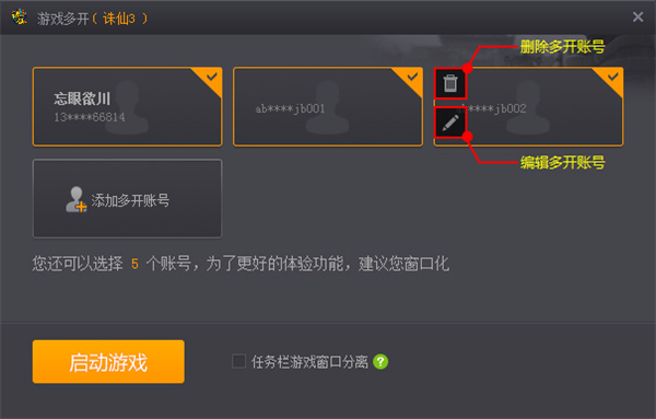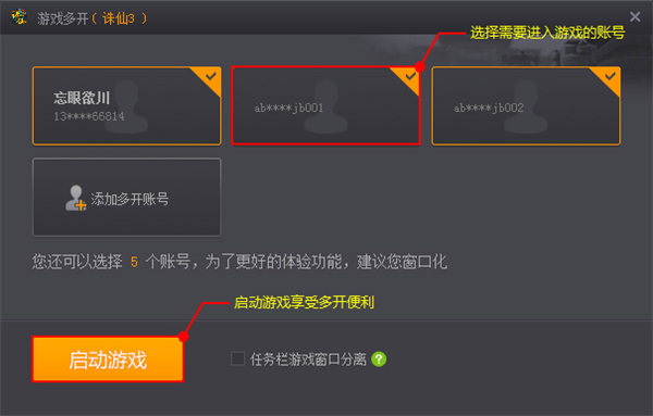 3、添加好多开账号后,选择您需要进入游戏的账号,点击“启动游戏”,就可以享受完美游戏平台为您带来的多开游戏便利啦