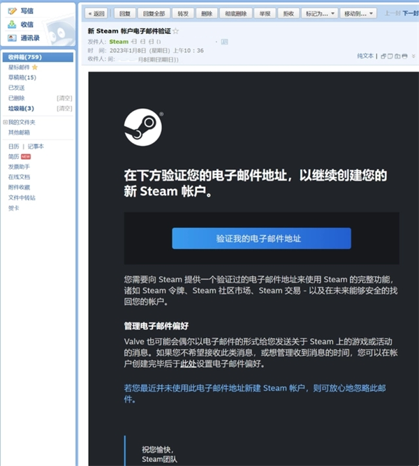 5、登录你的邮箱,验证你的电子邮件,打开steam的验证邮件,点击“验证我的电子邮件地址”这是会跳转到“电子邮件已验证的页面,说明你已经验证成功了。然后返回到客户端,继续完成注册。