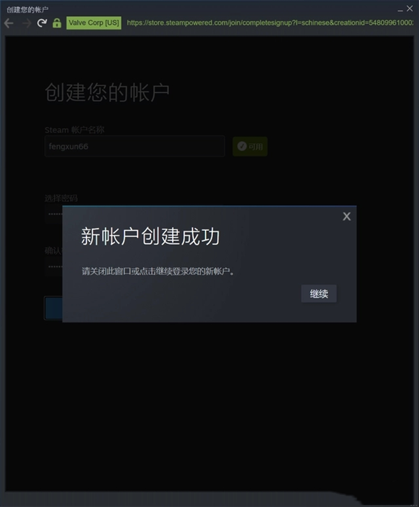 7、这时会提示“新帐户创建成功”点击“继续”就会跳转到登录界面。到此,你就成功的注册了steam账号。现在可以登录畅玩了。