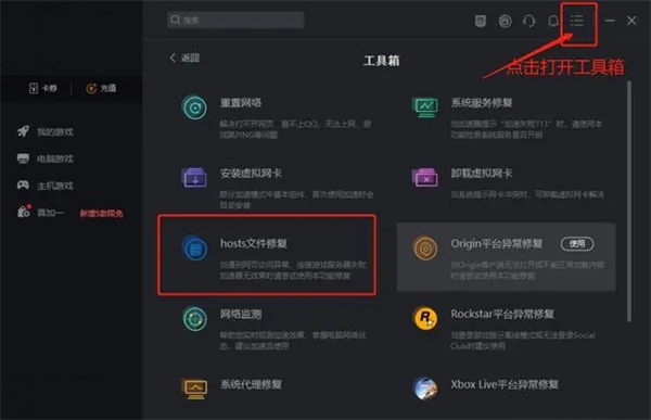 Hosts文件被损坏也会影响网络连接,建议玩家打开加速器,点击工具箱,然后再点击hosts文件修复按钮,就可以轻松帮助玩家一键检测和修复破损的文件。