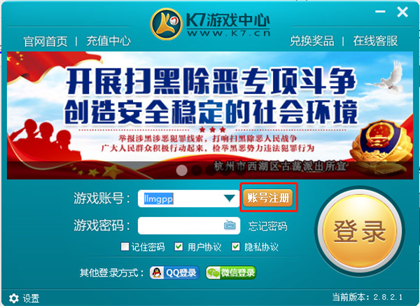 1、从本站下载并安装K7游戏中心,一键运行打开2、点击界面上的“账号注册”按钮进行注册