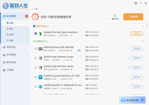对计算机驱动状态进行检测,一键修复异常驱动。