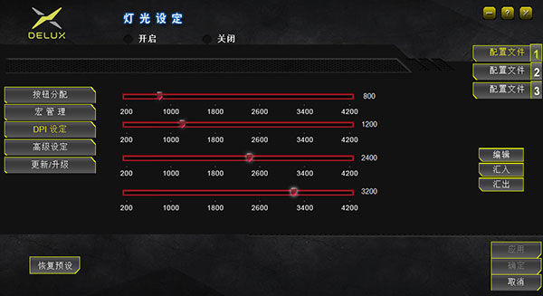 界面左侧位置点击“DPI设定”,移动拖动条,可进行鼠标DPI档位数值修改。设置成功后,点击应用,即可完成设置。