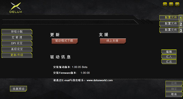 打开驱动设置界面(需连接设备,否则无法打开驱动),进行按键设置、宏设置、DPI设置、高级设置、更新升级设置等,可进行多组配置自定义。1、按键设置