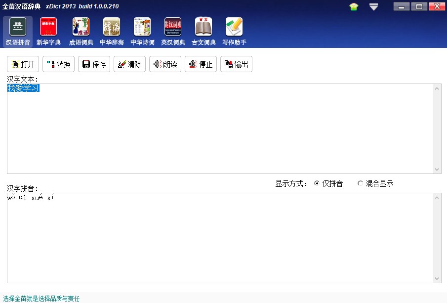 1、拼音翻译:您可以轻松地把所有汉字转换为带声调的拼音,包括3000多个多音字(其拼音用反斜杠“/”隔开),再也不用担心哪个字不会认!您也可以打开文本文件,转换成拼音后保存。也可以点击朗读,把文本朗读出来。也可以输出到语音文件,听着欣赏。2、新华字典:本字典可查询汉字2万余个,每个汉字都有详细的拼音、词组、解释和示例。在主界面直接点击“字典”或右击内容区弹出的“新华字典”菜单,均可打开《新华字典》。在输入框中点击或选中汉字,即可方便地显示出查询结果。