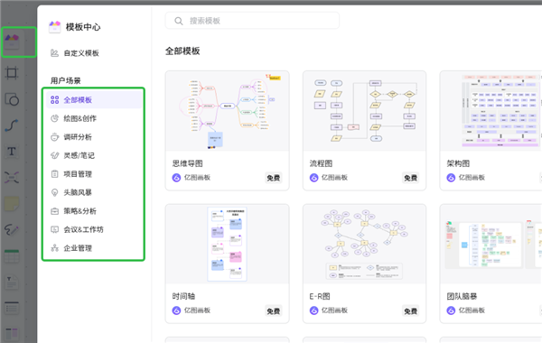 2、用户可在画板中点击模版图标,插入流程图、笔记等各类模版。