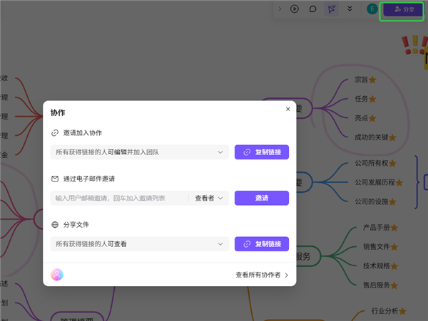 4、完成画板编辑后,点击右上角分享,将连接分享给成员即可开始些协作。