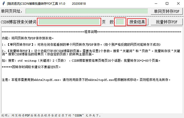 本程序需要用到wkhtmltopdf.exe,请勿将同目录下的wkhtmltopdf.exe程序删除或移动。否则程序将无法转存。