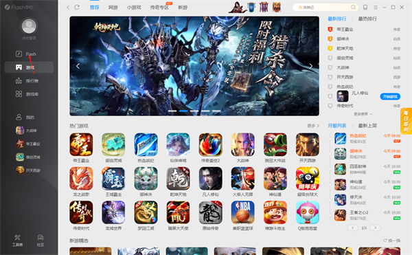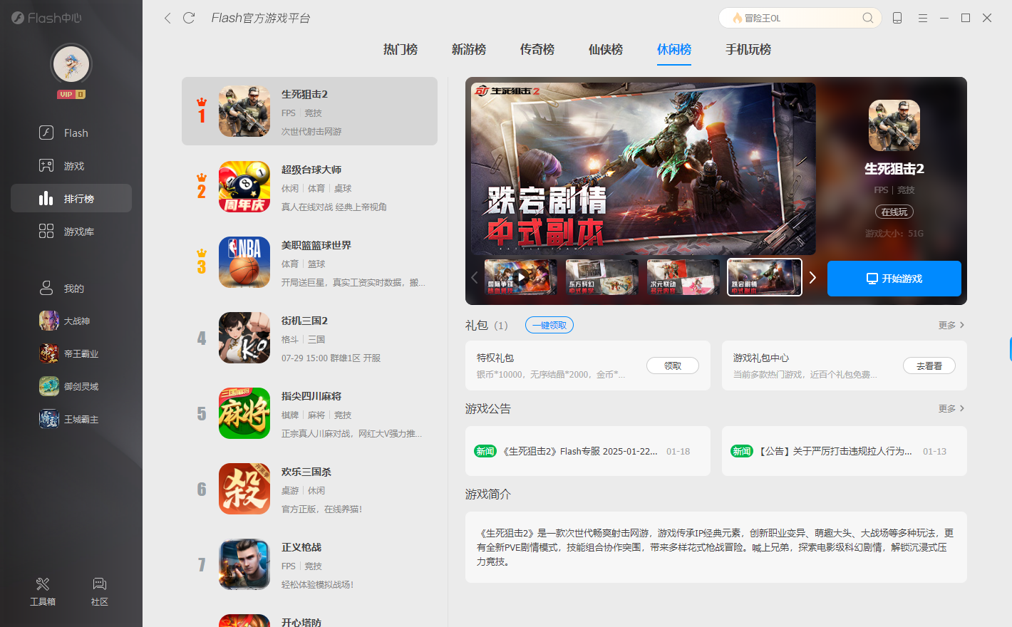集成单机Flash游戏(如《冒险王OL》),支持游戏记录保存与排名系统。