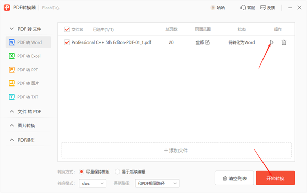 6、将需要转换的PDF直接拖拽至箭头处,随后点击第二张图右上角“播放键”,或者点击右下角的“开始转换”。