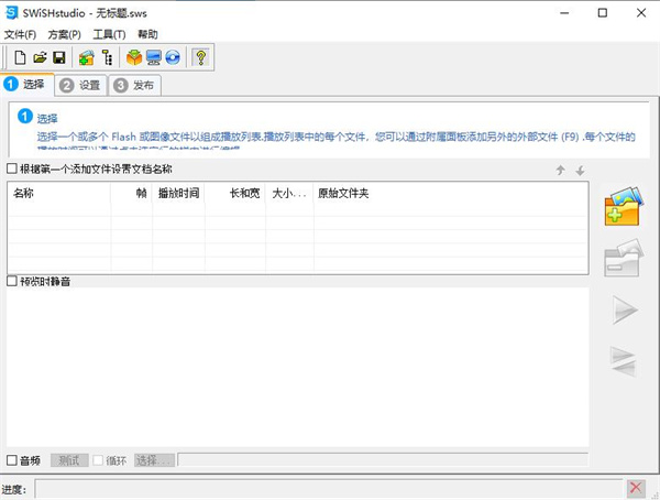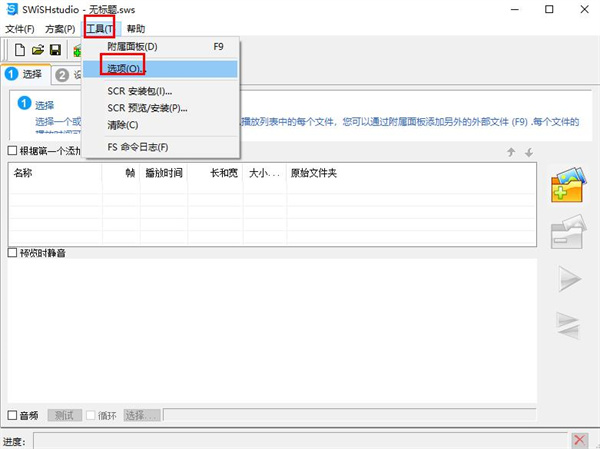 选择一个或多个flash或图像文件以组成播放列表,播放列表中的每个文件你可以通过附属面板添加另外的外部文件(F9),每个文件的播放时间可以通过点击“工具”—“选项”进行编辑