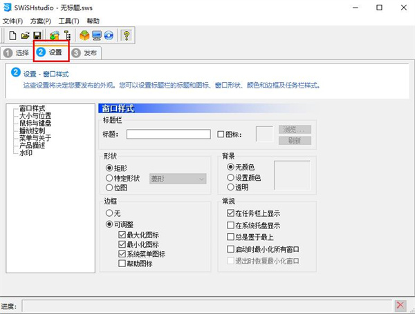 这些设置将决定您要发布的外观,您可以设置标题栏的标题和图标,窗口形状,颜色和边框及任务栏样式