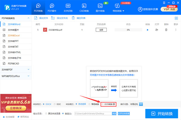 通过「点击添加文件」按钮,将需要转换的PDF文档导入,如果文件是由图片转换而来,则需要启用「OCR文字识别」功能。完成后,点击「开始转换」,即可自动进入转换操作。